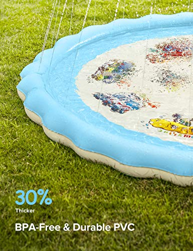 Safe Sprinkler for Kids – PVC non-slip textures prevent children from slipping. A wavy line near the rim of the splash pad, increases grip and safety. The water toys are both BPA and phthalates free, environmentally friendly materials ensure children’s safe play